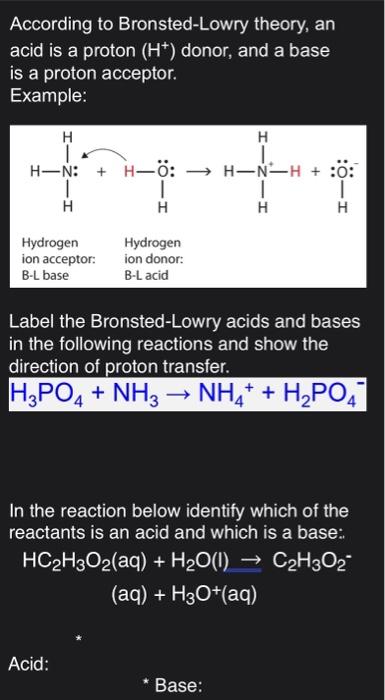 According to Bronsted Lowry theory acids are proton donors and bases are proton acceptors. Find out how to identify the Brønsted-Lowry acid and base in a reaction and recognize the conjugate partner of each. According to Bronsted-Lowry theory an acid is a substance that can _____.